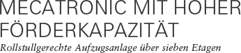 Den sehr restriktiven Anforderungen an die Aufzugsanlage wurde mit einem Mecatronic in einer individuellen Ausstattungsvariante entsprochen. Der hochwertige Antrieb der Firma Ziehl-Abegg erfüllt gemeinsam mit der effizienten Steuerung der Firma Kollmorgen die anspruchsvollen Vorgaben an die bereitgestellten Förderkapazitäten der Aufzugsanlage. Die Tragkraft der Aufzugsanlage ergibt sich unmittelbar aus der geforderten Kabinengrundfläche, wobei sich der Kunde durch die sich aus dem Treppenhaus ergebenden engen Radien für Rollstuhlfahrer bewusst für vierteilig zentral öffnende Schiebetüren mit einer Breite von 1.000 mm entschieden hat, deren Schließ- und Öffnungszeiten möglichst kurz sein sollten. Die Tableaus sollten durch ihren flächenbündigen Einbau in der Kabine und in den aufwändig gestalteten Portalen des Gebäudes den hochwertigen Gesamteindruck unterstreichen. Der Kabinenfußboden greift den edlen Werkstein aus dem Treppenhausbereich auf.