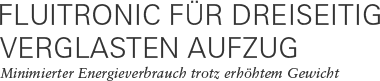 Ein Fluitronic in der Ausstattungsvariante transparence 630 erfüllt die sehr restriktiven Anforderungen an die Aufzugsanlage. Die Tragkraft der Aufzugsanlage ergab sich unmittelbar aus der geforderten Kabinengrundfläche. Durch die Wahl eines fluitronischen Aufzugs konnte die statische Anbindung an den Aufzugsschacht lediglich an der Schachtrückseite erfolgen. Um den schalltechnischen Schornsteineffekt in dem Glasschacht auszuschließen, ermöglichte es der Einsatz eines Maschinenschranks, sämtliche Geräuschquellen aus dem Schacht zu entfernen. Die Ausführung des Schachtgerüsts erfolgte zur Einsparung eines innenliegenden Treppenhausgeländers als massive Stahlkonstruktion mit hochwertigem Sicherheitsglas.